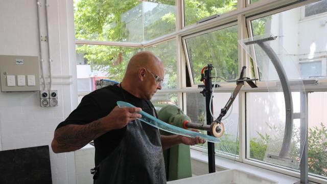 Shane sanding glass. Photo by Julia Boyd/ ANU